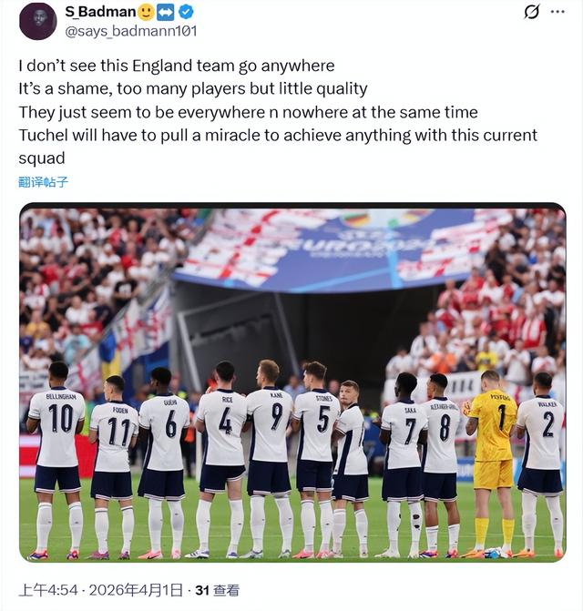 有球迷冷静分析:在我看来,这支英格兰走不远。很可惜,英格兰球员不少,但缺乏高质量,给人的感觉是“无处不在”,但又是“压根不存在”。图赫尔想要凭借这套阵容取得成功,除非有奇迹。